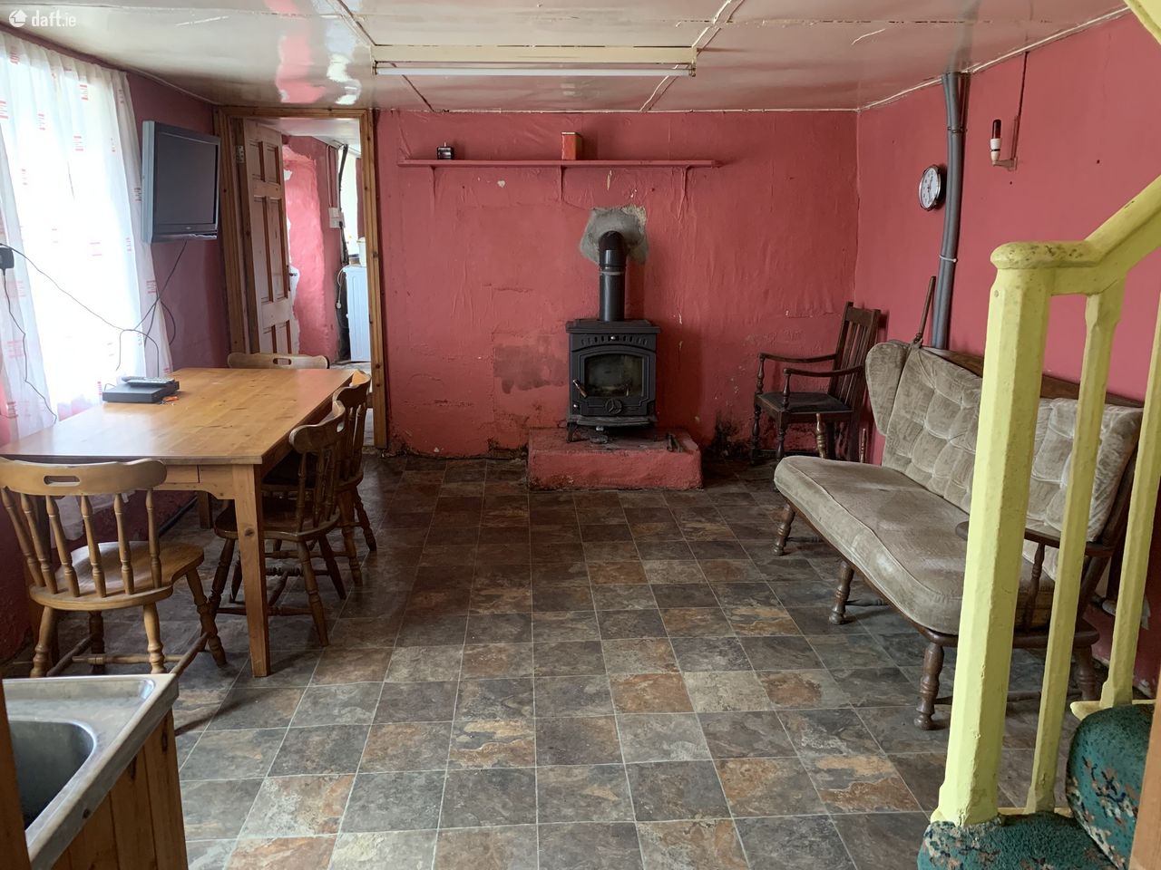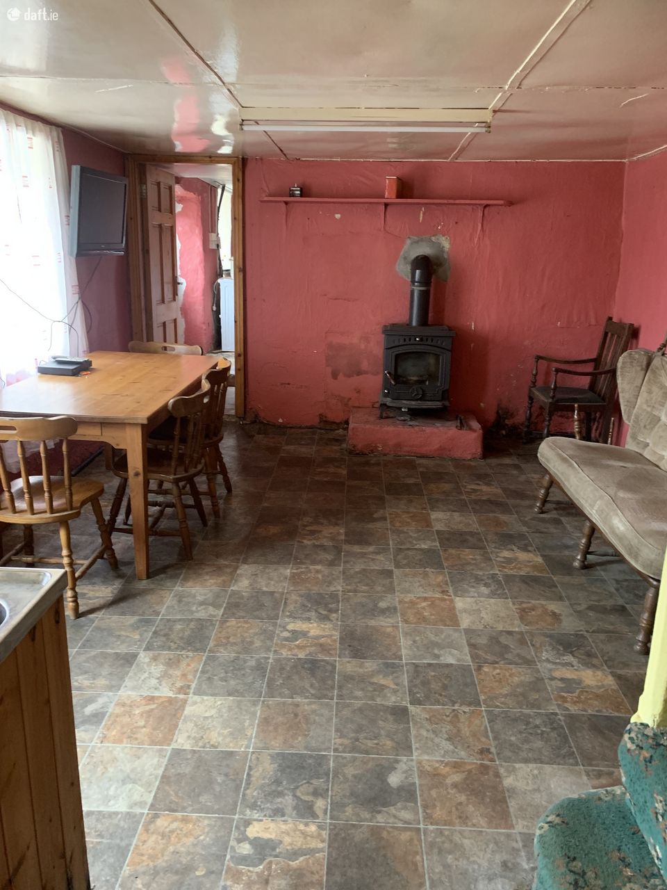 Dining room / Kitchen – 4.86m x 3.8m – vinyl floor, cast iron stove