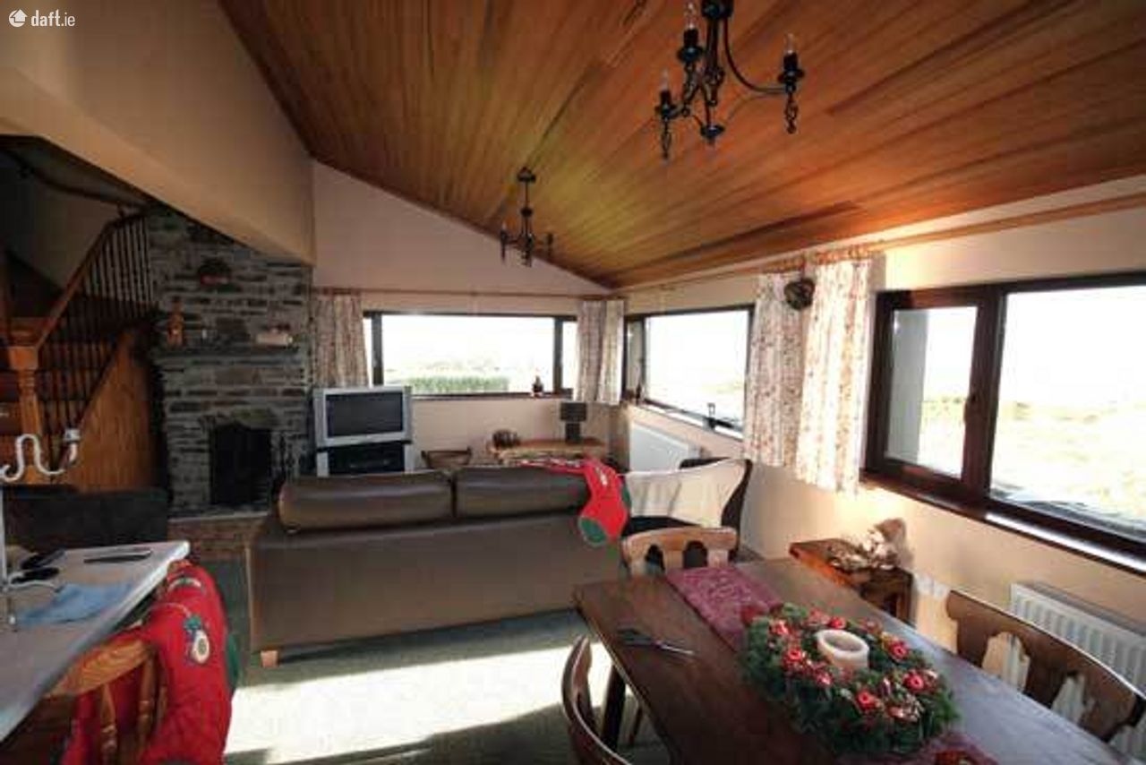 Dining / Living room – 6.7m x 4.5m with wood burning stove, carpet flooring, two radiators and large panoramic windows overlooking Coulagh Bay.